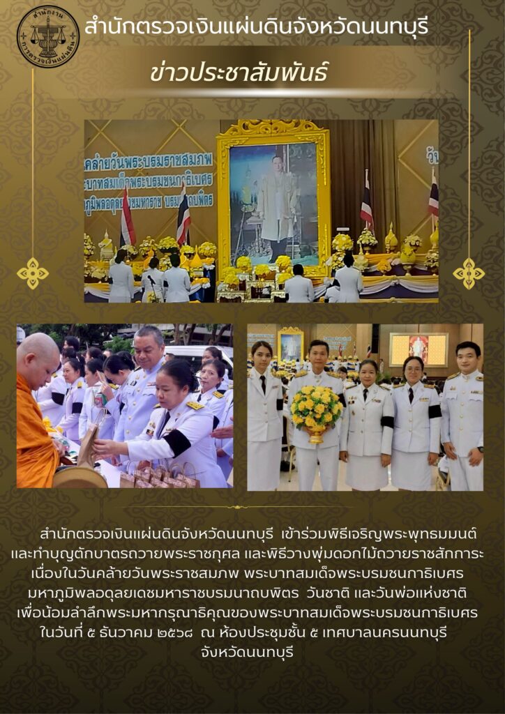 สํานักตรวจเงินแผ่นดินจังหวัดนนทบุรี โดยนางสาวณัฐมน สุขสมบัติ ผู้อำนวยการสำนักตรวจเงินแผ่นดินจังหวัดนนทบุรี พร้อมด้วยบุคลากรภายในสังกัด สตจ.นนทบุรี เข้าร่วมพิธีเจริญพระพุทธมนต์ และทําบุญตักบาตรถวายพระราชกุศล และพิธีวางพุ่มดอกไม้ถวายราชสักการะ เนื่องในวันคล้ายวันพระราชสมภพ พระบาทสมเด็จพระบรมชนกาธิเบศร มหาภูมิพลอดุลยเดชมหาราช บรมนาถบพิตร วันชาติ และวันพ่อแห่งชาติ เพื่อน้อมล่าลึกพระมหากรุณาธิคุณของพระบาทสมเด็จพระบรมชนกาธิเบศร ในวันที่ ๕ ธันวาคม ๒๕๖๘ ณ ศาลากลางจังหวัดนนทบุรี และห้องประชุมชั้น ๕ เทศบาลนครนนทบุรี จังหวัดนนทบุรี